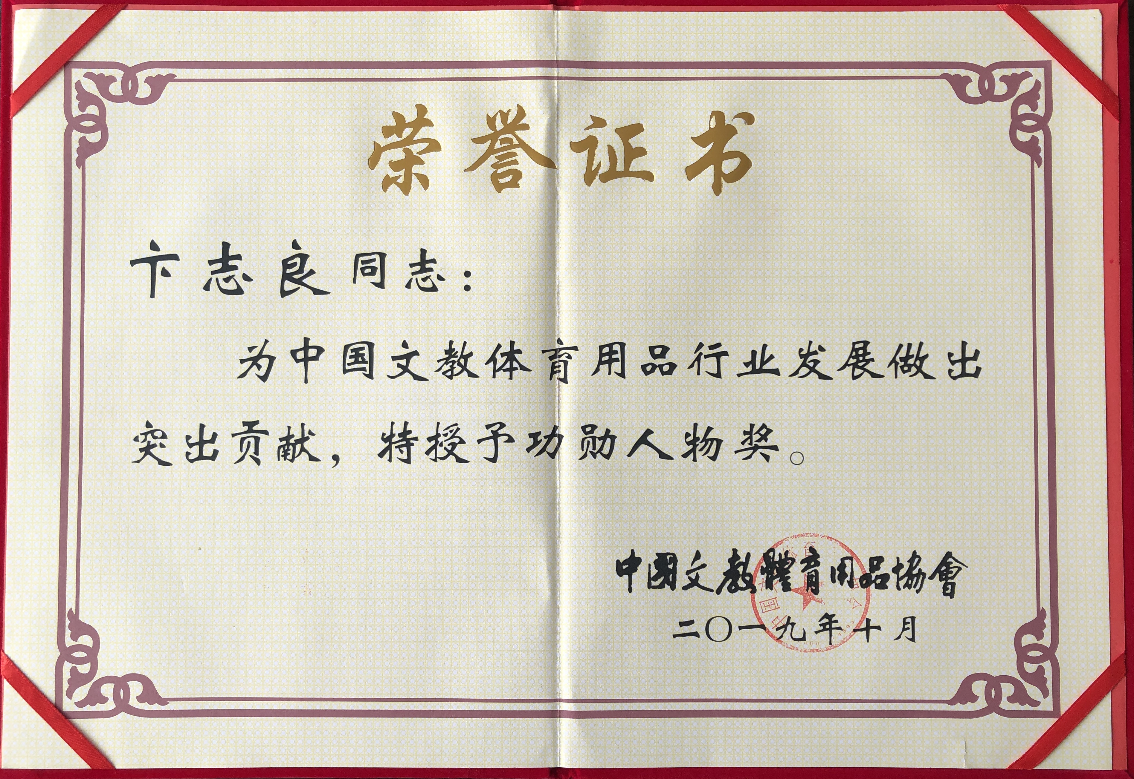 10月18日,中国文教体育用品协会第八届三次理事会暨成立三十周年庆典大会在北京人民大会堂隆重召开。1989—2019三十年间,我国文教体育用品行业发生了翻天覆地的变化,取得了辉煌的成绩。为弘扬艰苦创业、改革创新精神,鼓舞全行业奋勇前行的斗志,暨协会成立三十周年之际,文体协会隆重表彰一批为行业发展做出突出贡献的模范人物,金年|jinnianhui今年会体育产业集团董事长卞志良荣获“功勋人物奖”。